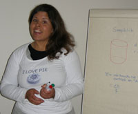 Als we de site bekijken, snappen we gelijk waarom Carmen van de 1200 kandidaten de finale haalde. Wij zouden ook wel bij haar in de klas willen zitten! Briljant is de les Passie voor chocolade pi(e) (op de site een verslag met foto's en filmpjes). Carmen vertelt aan de hand van chocoladetaarten en soepblikken over pi, vergrotingen en het Droste-effect. De leerlingen bakken samen met haar nog lekkere taarten ook. Hier zien jullie Carmen in actie.